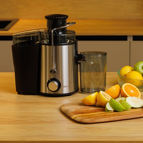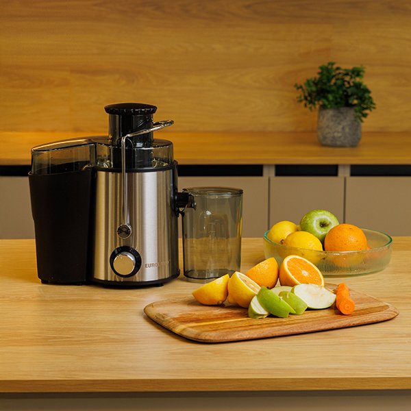 Αποχυμωτής Eurolamp 850W Inox με μεγάλο στόμιο, λεπίδες ανοξείδωτου ατσαλιού και 2 ταχύτητες. Ιδανικός για φρέσκους, φυσικούς χυμούς κάθε μέρα.