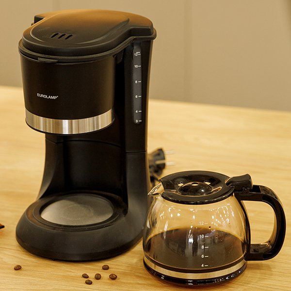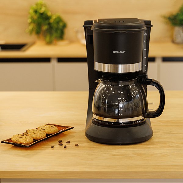 Καφετιέρα φίλτρου Eurolamp 900W με γυάλινη κανάτα 1.2L και χωρητικότητα έως 12 φλιτζάνια. Διαθέτει πλάκα διατήρησης θερμότητας και αντικατακλυσμικό σύστημα.