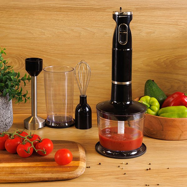 Το ραβδομπλέντερ περιλαμβάνει μπλέντερ ράβδου με λεπίδες Inox, δοχείο κοπής με καπάκι και αναδευτήρα αυγών, καλύπτοντας κάθε ανάγκη στην κουζίνα — από σάλτσες και σούπες μέχρι smoothies, κρέμες ή ζύμες.